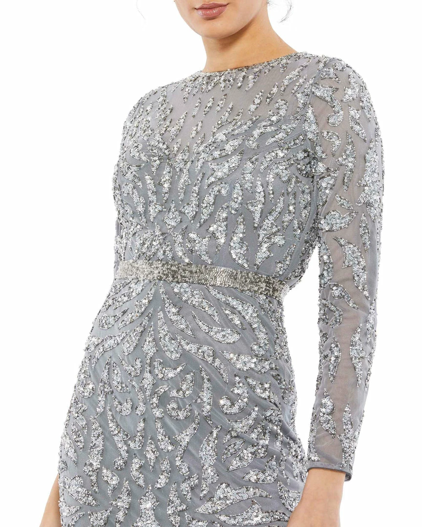 It’s your time to shine in this embellished sheath dress. The monochrome dress is decked with sequined and beaded shapes that add flair to the sleek silhouette featuring an illusion neckline, slim long sleeves and a back slit. Add pumps and an envelope clutch for holiday parties and seasonal soirées.