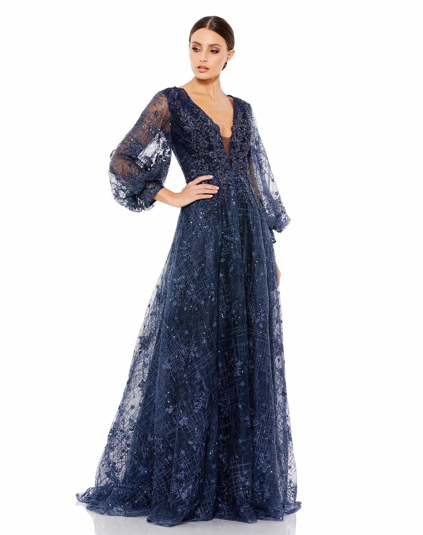 Mac Duggal Shop For Embellished Plunge Neck Puff Sleeve A-Line Gown