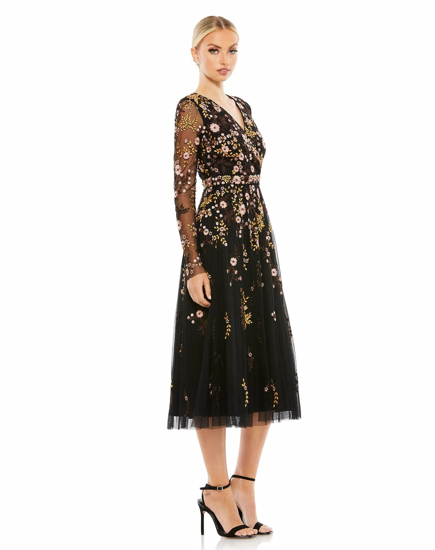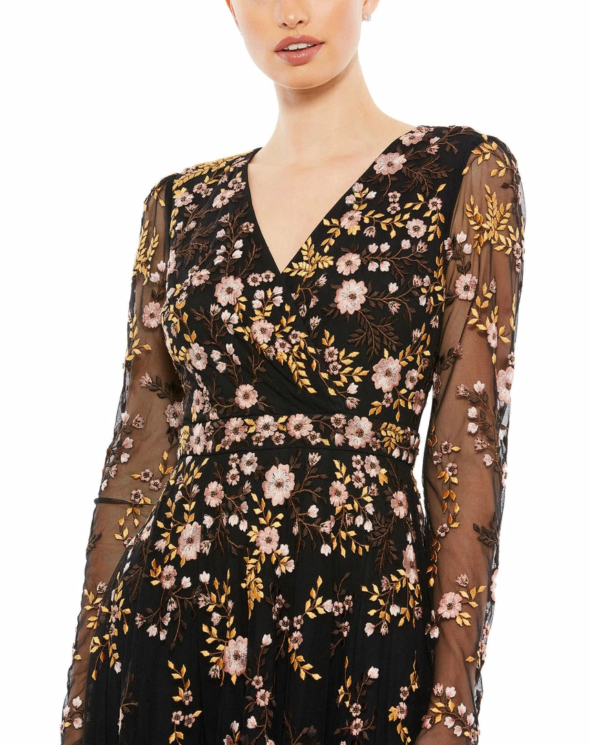 This ethereal cocktail dress is made from soft netting embroidered with pastel botanicals. The dress is styled with a surplice v-neckline, sheer long sleeves, and a subtle a-line skirt. Lightweight and fully lined through the body, this dreamy dress will be your go-to for any féte.