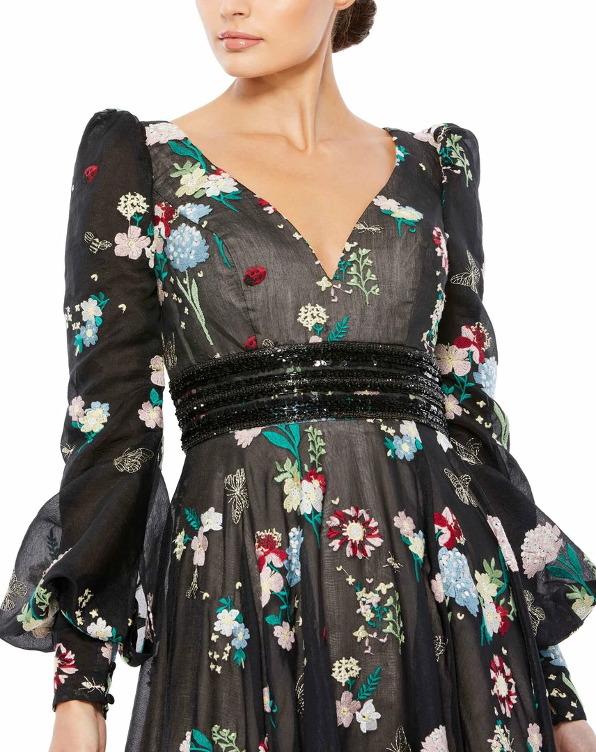 Floral embroidered long sleeved maxi gown accented with a beaded belt.