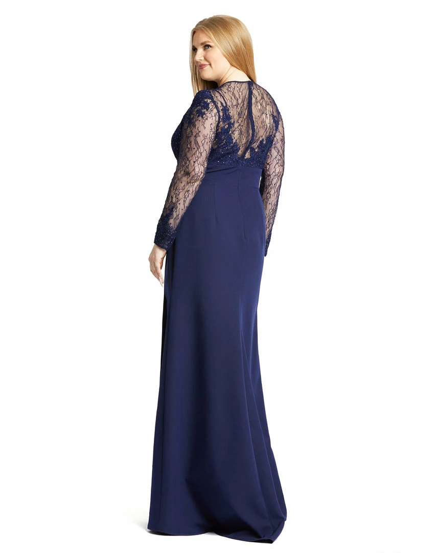 Sexy lace embellished gown on the bodice with sweetheart neckline and thigh-high slit.