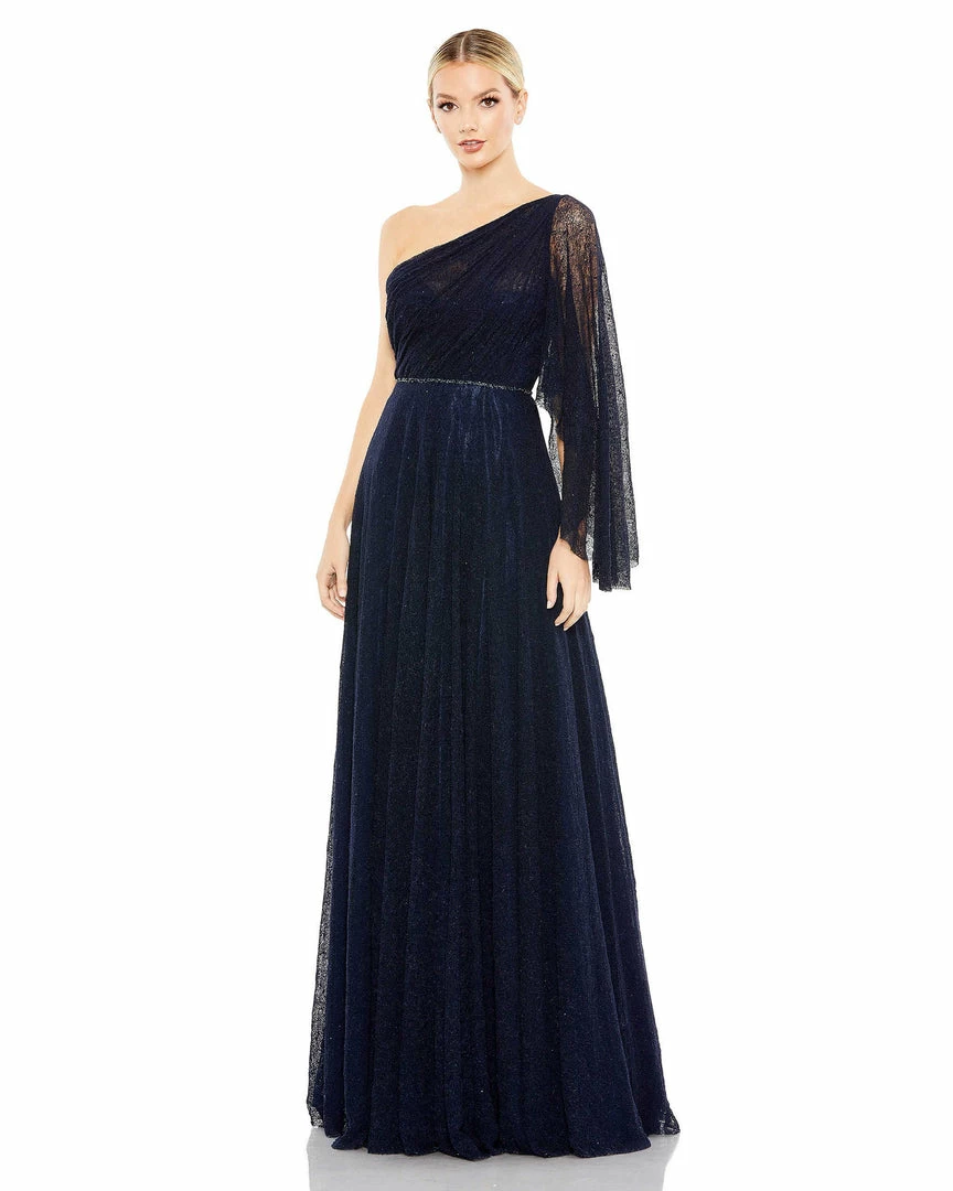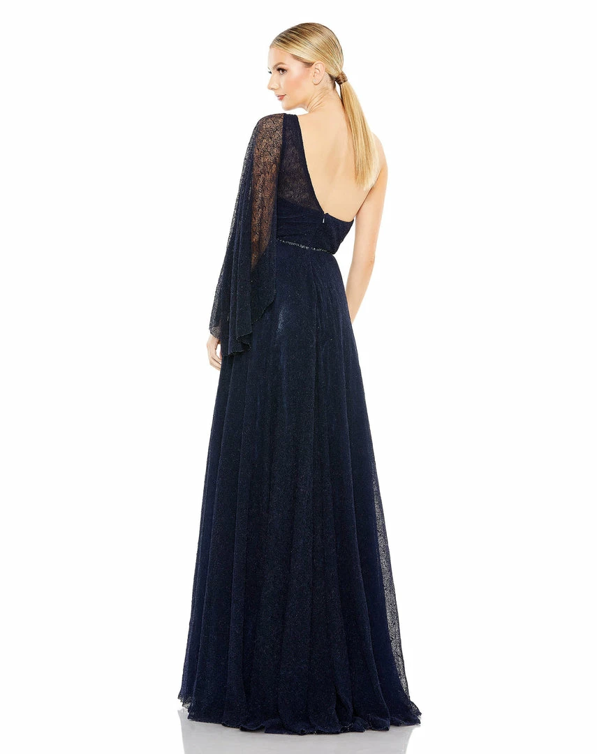 One-shoulder floor length gown with dramatic bell sleeve and hand-beaded belt.