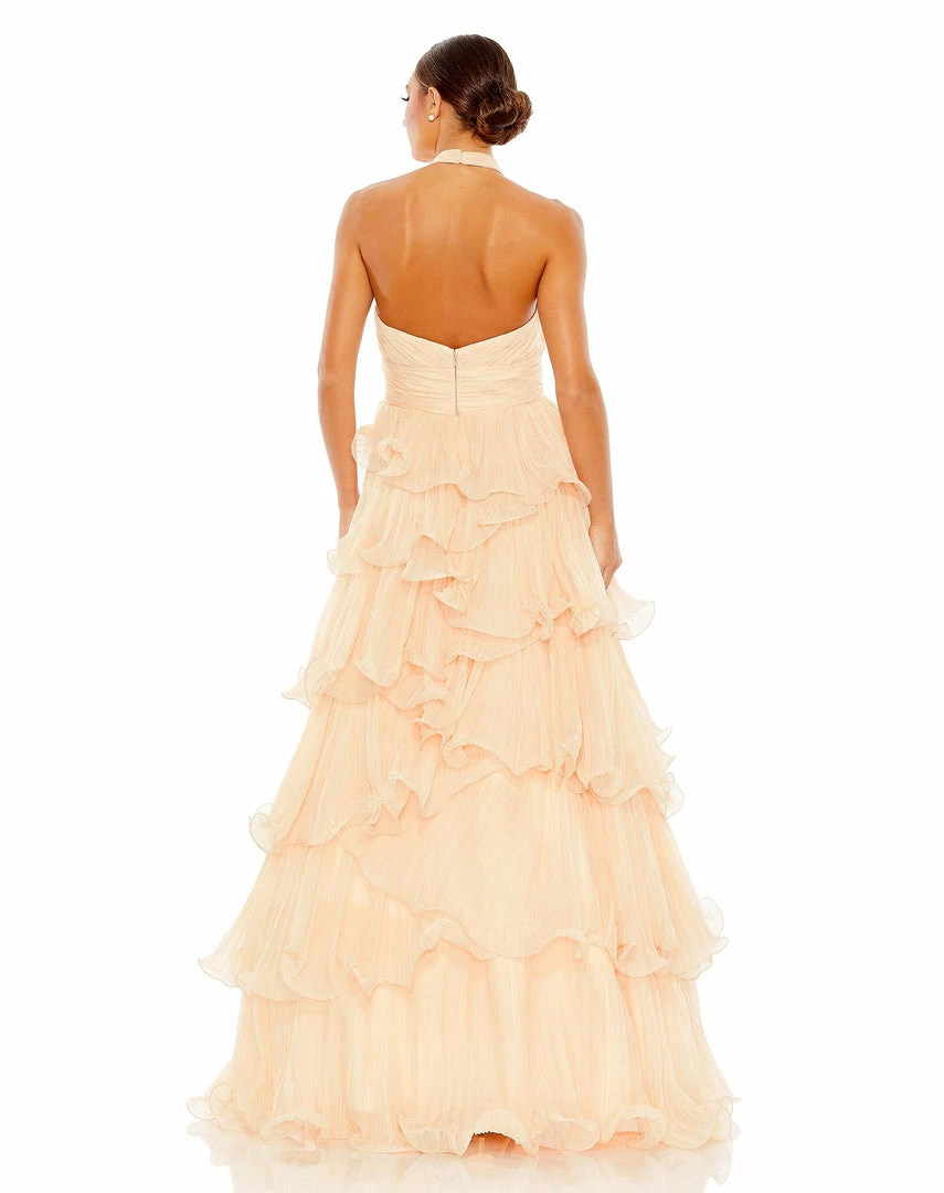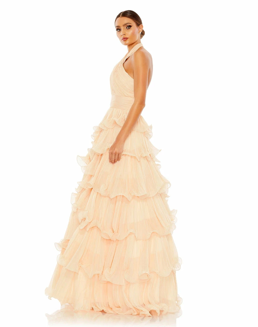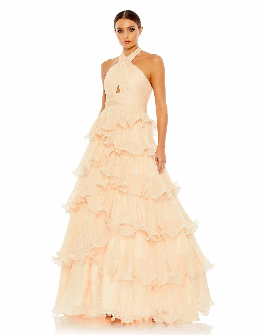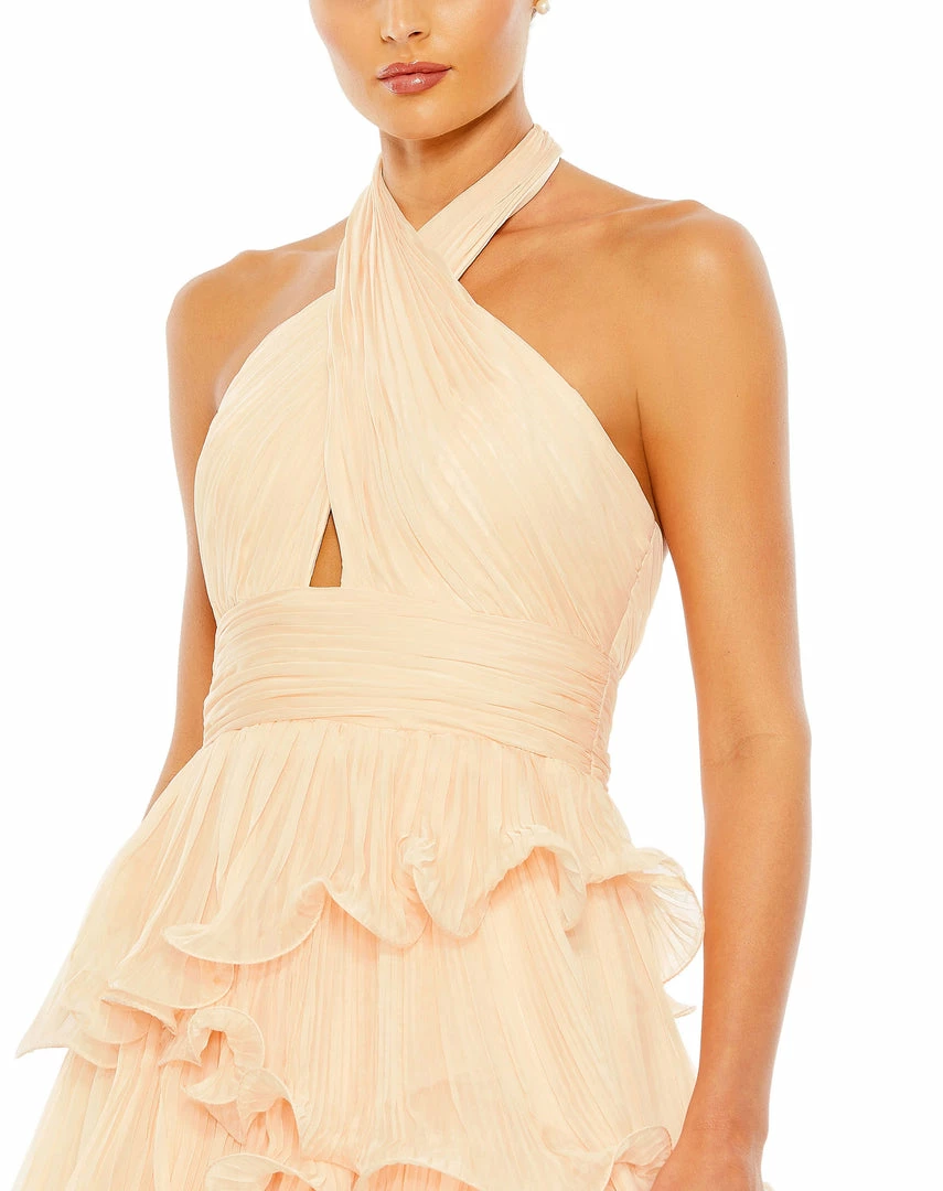 Pretty and playful, this prom gown is a joy to wear, styled with allover pleats and sculptural ruffled tiers. The gown is designed with a contemporary crisscross halter, a cinched cummerbund-inspired waistband, and a voluminous skirt.