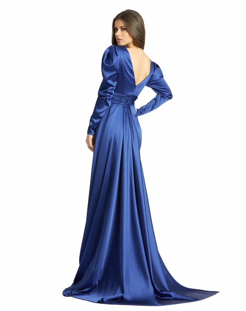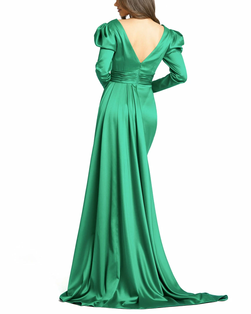 Floor-length satin gown with puff-shoulder long sleeves, faux-wrap bodice, v-neckline, pleated waistband, and a thigh-high slit.