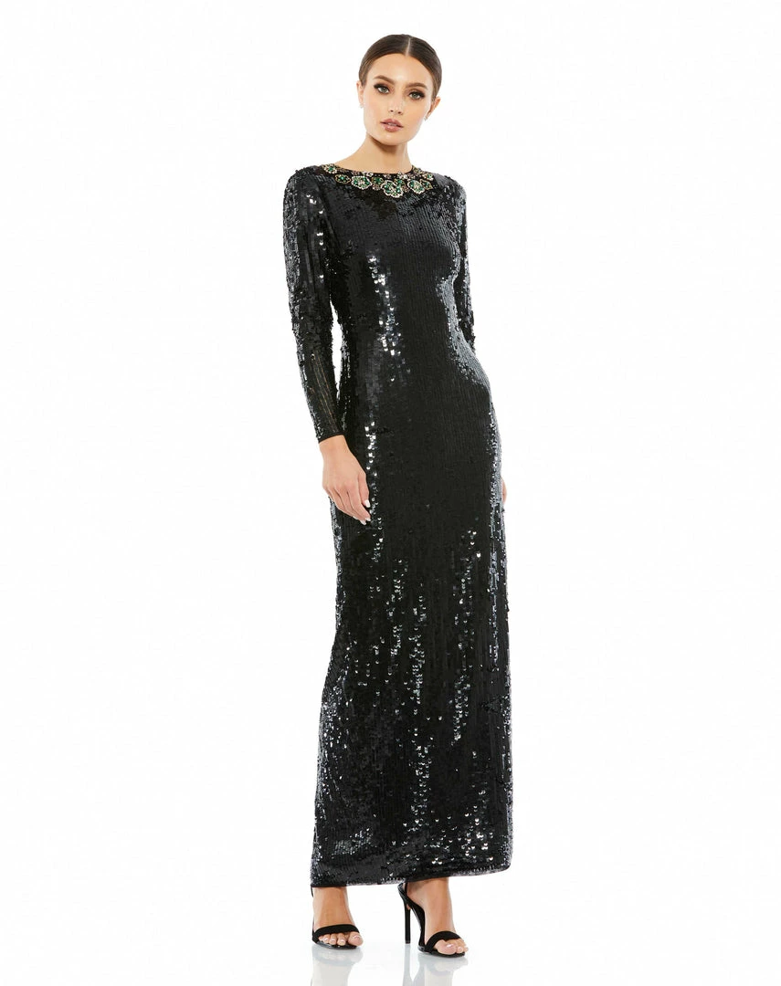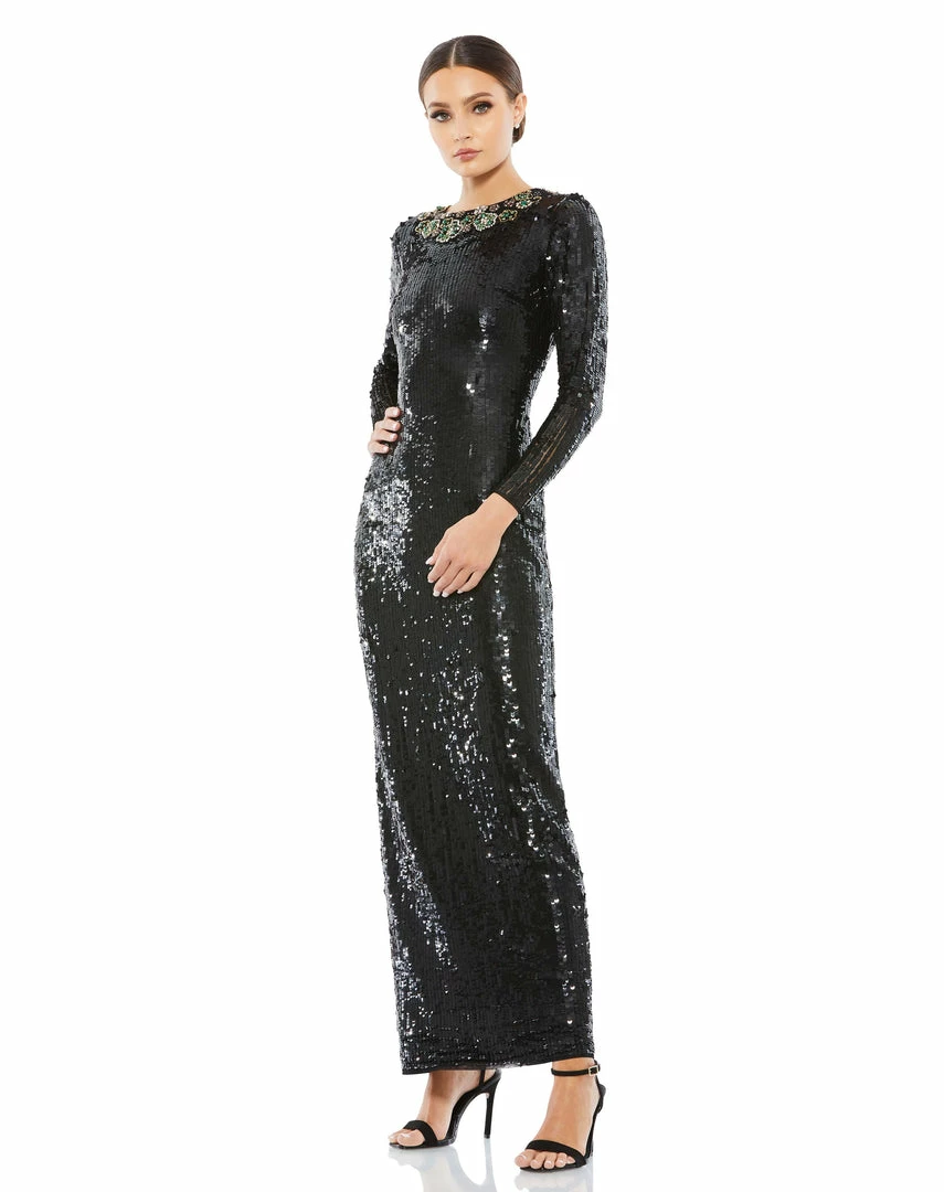 - Black fully sequined gown with an emerald-toned jewel encrusted collar