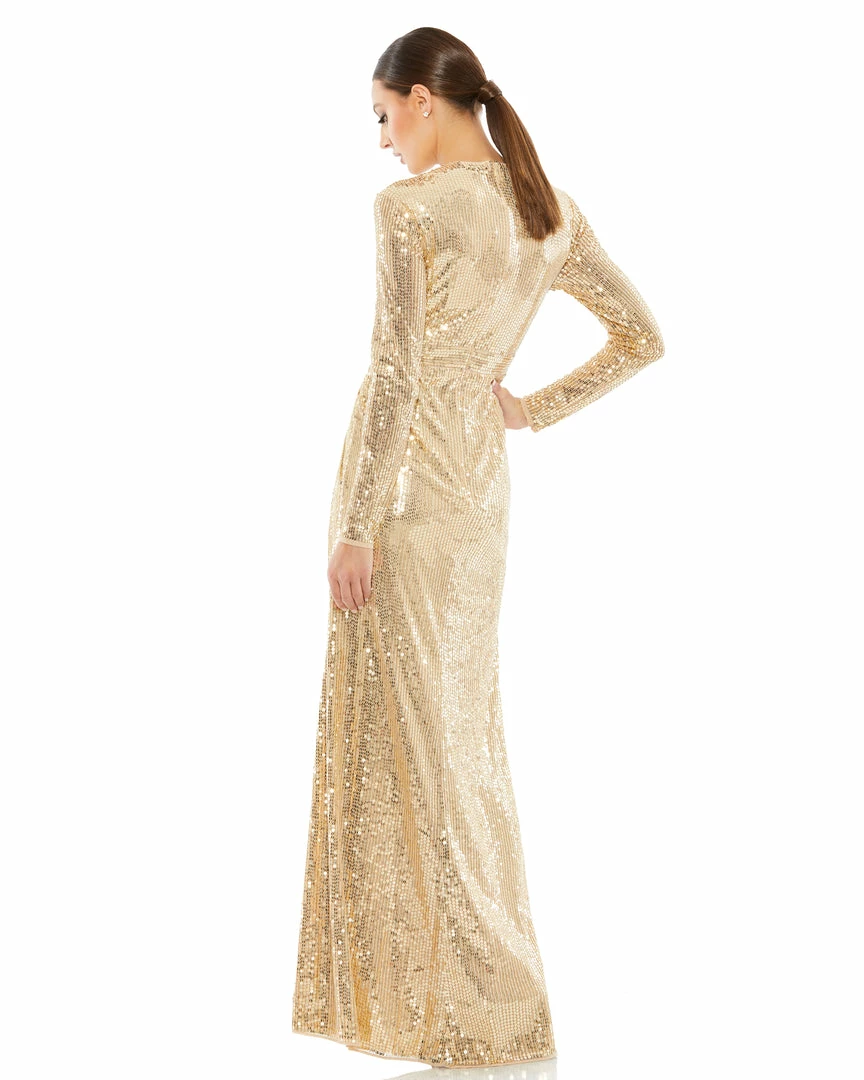 Bring on the shine! This hand-sequined gown is a fashion-forward choice for any formal affair. With a high round neckline, long sleeves, and a floor-grazing skirt, this modest silhouette is accented by a draped skirt and inset waist detail. Sleeves feature hidden zippers for ease of dressing.