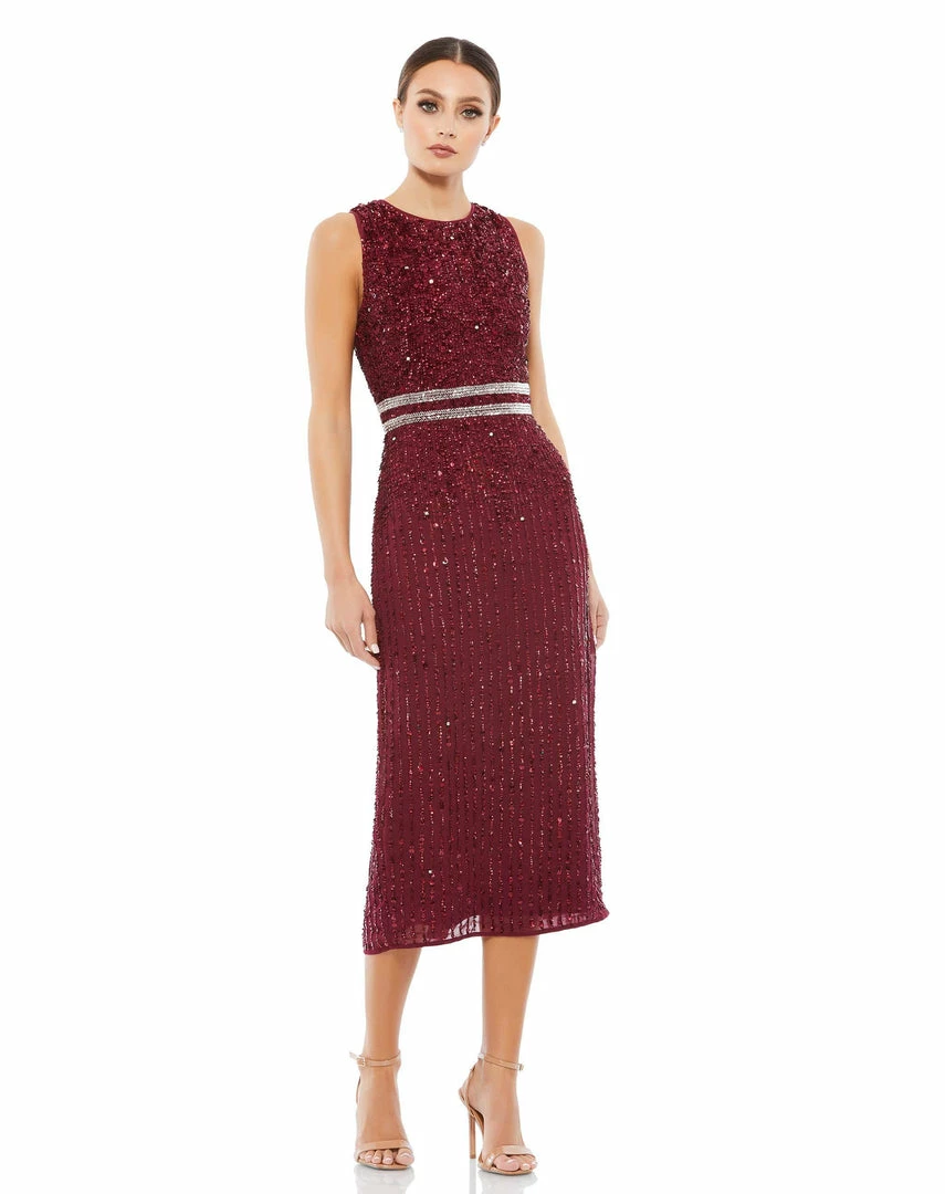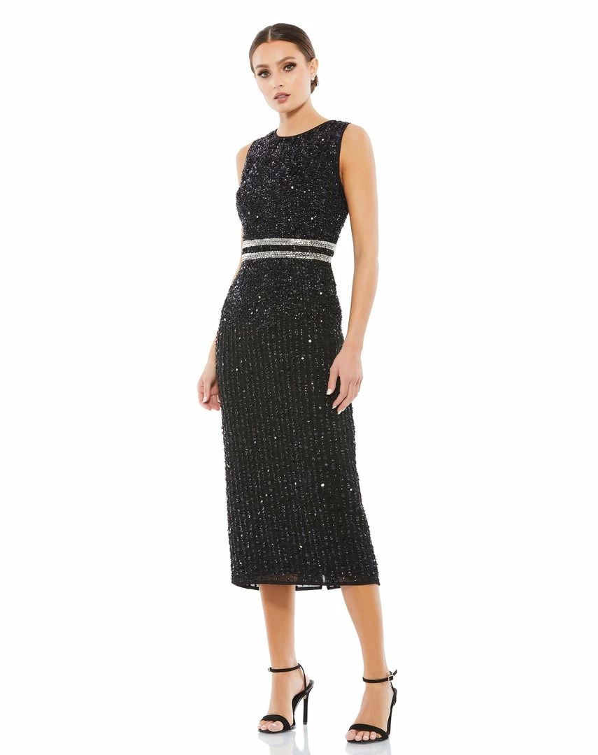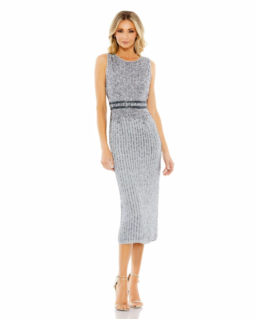 Elegant vertical-sequined sleeveless midi sheath dress with a flattering hand- beaded waist and back vent slit.