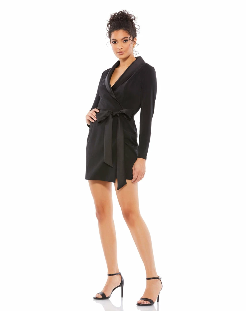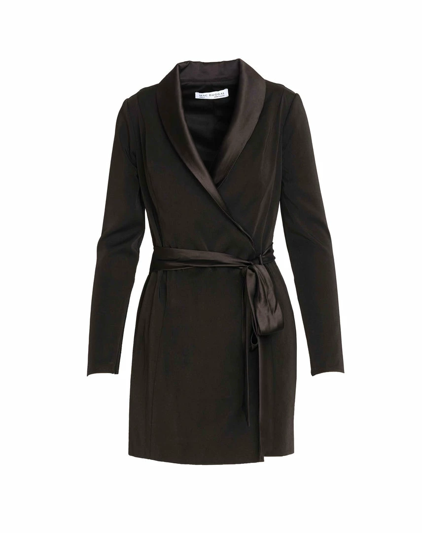 We’re in love with this tuxedo-inspired wrap dress that’s perfect for parties, holidays, and girls’ night out. The dress is cut well above the knee to showcase your gams and is styled with a satin shawl lapel and bow belt. Wear yours with glittery tights or bare legs and ankle-strap sandals.