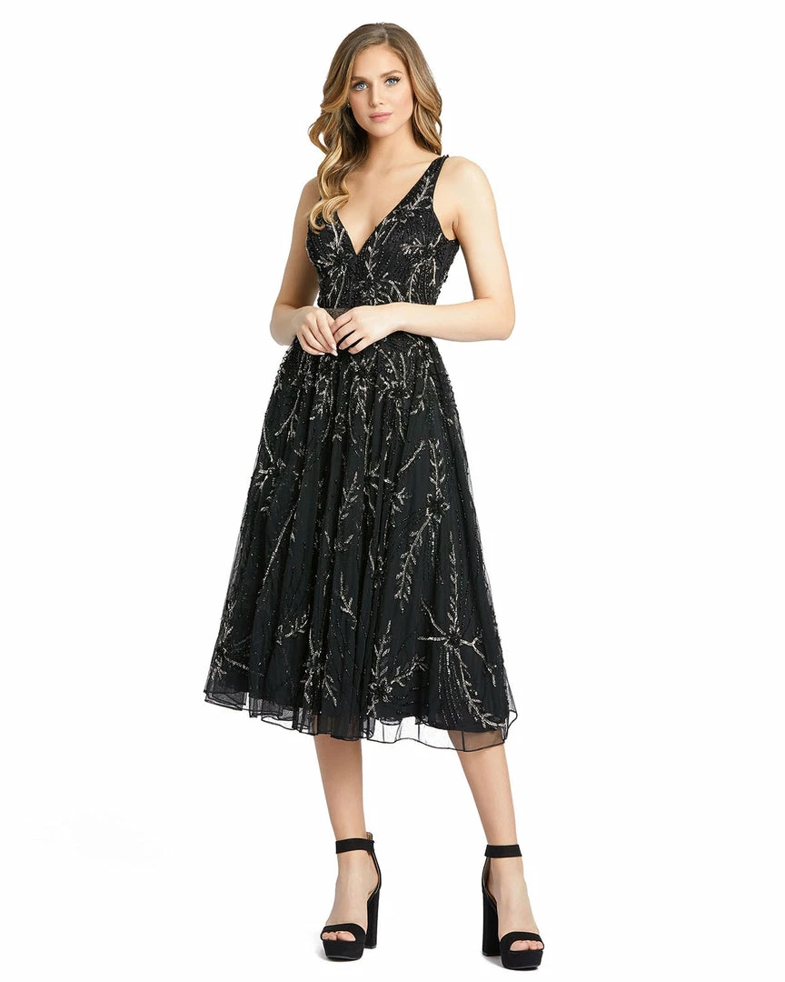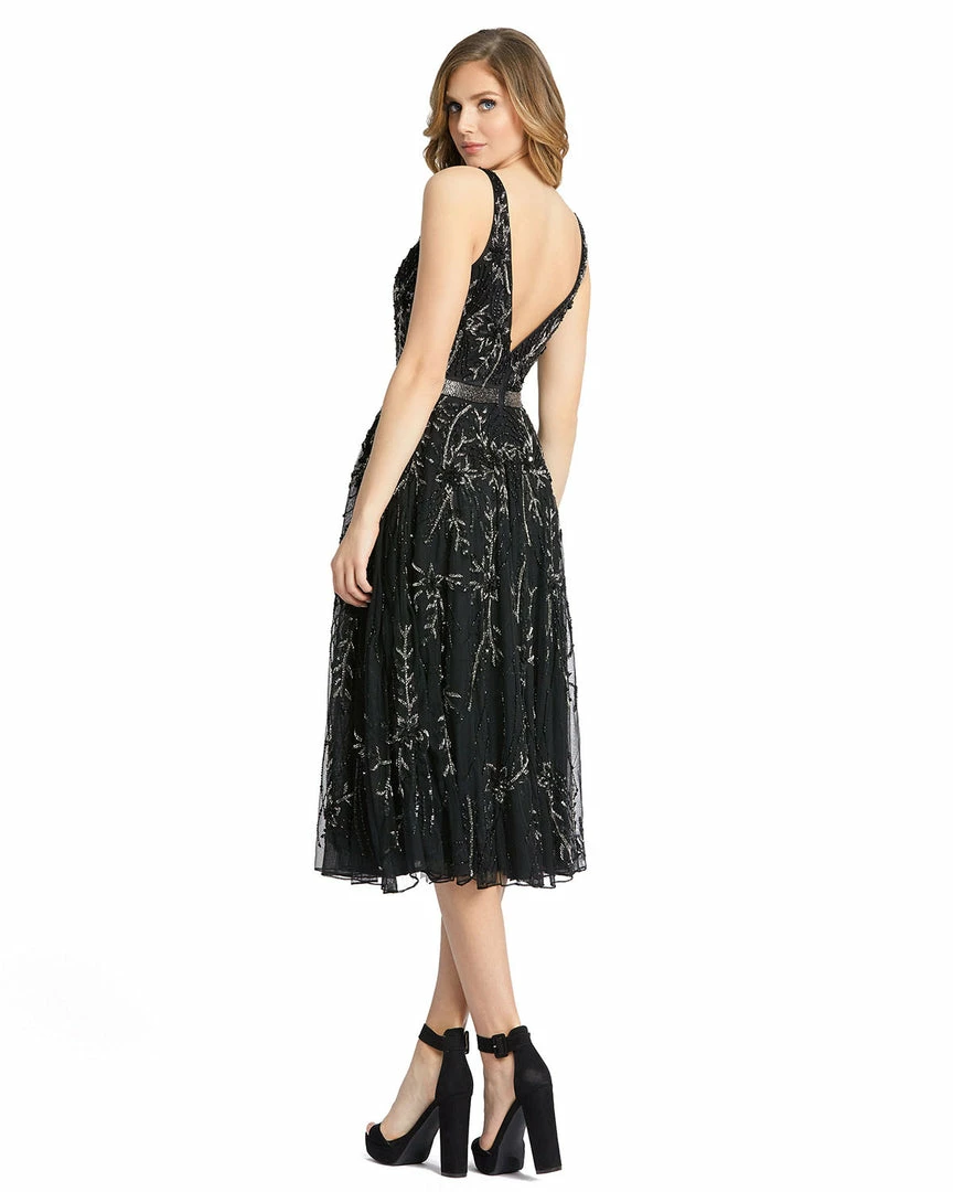 Sleeveless tea length cocktail dress with gorgeous bead and sequin details