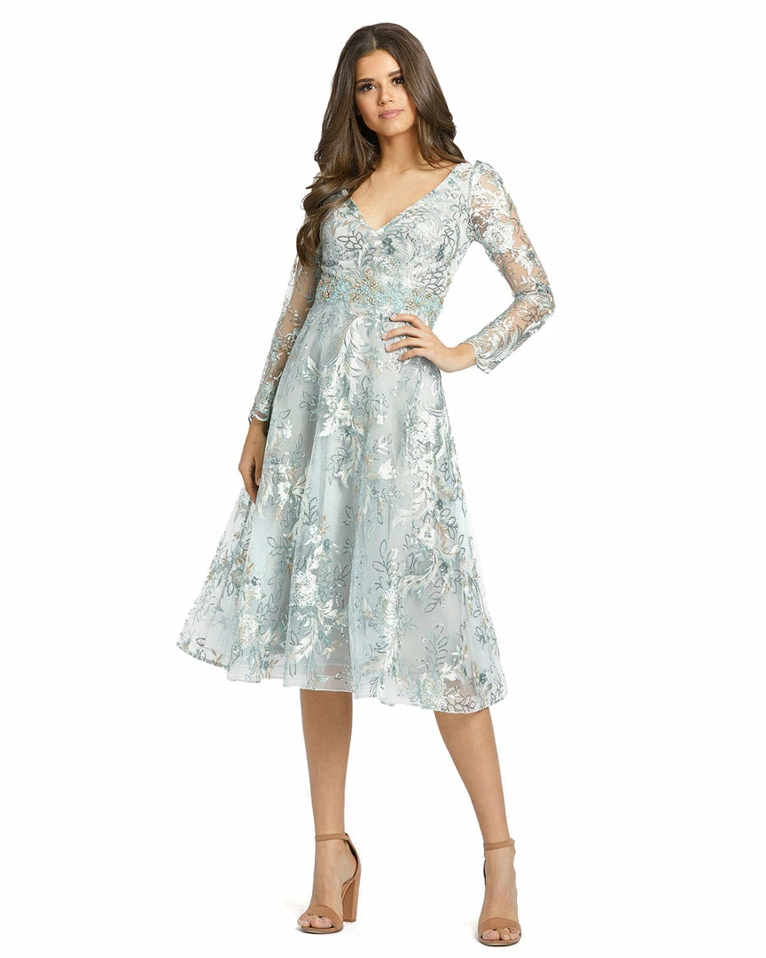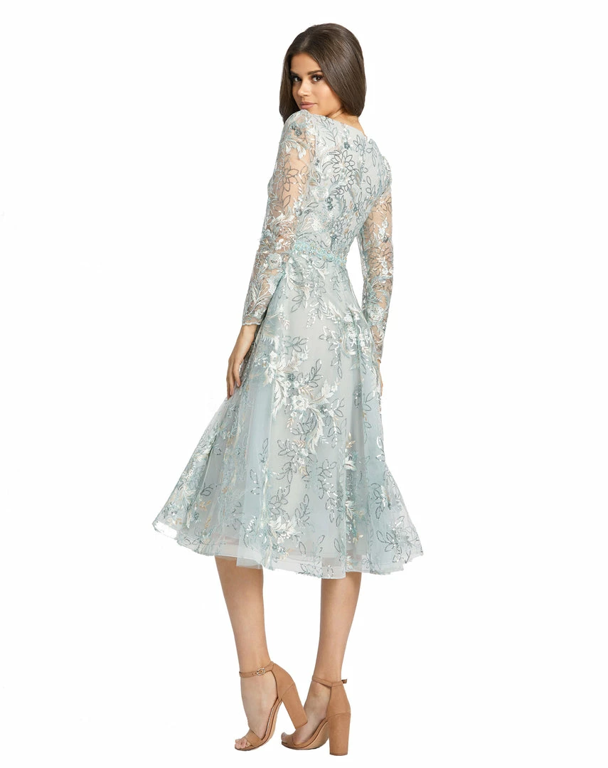 Sheer long sleeve midi dress with floral applique and embroidery.