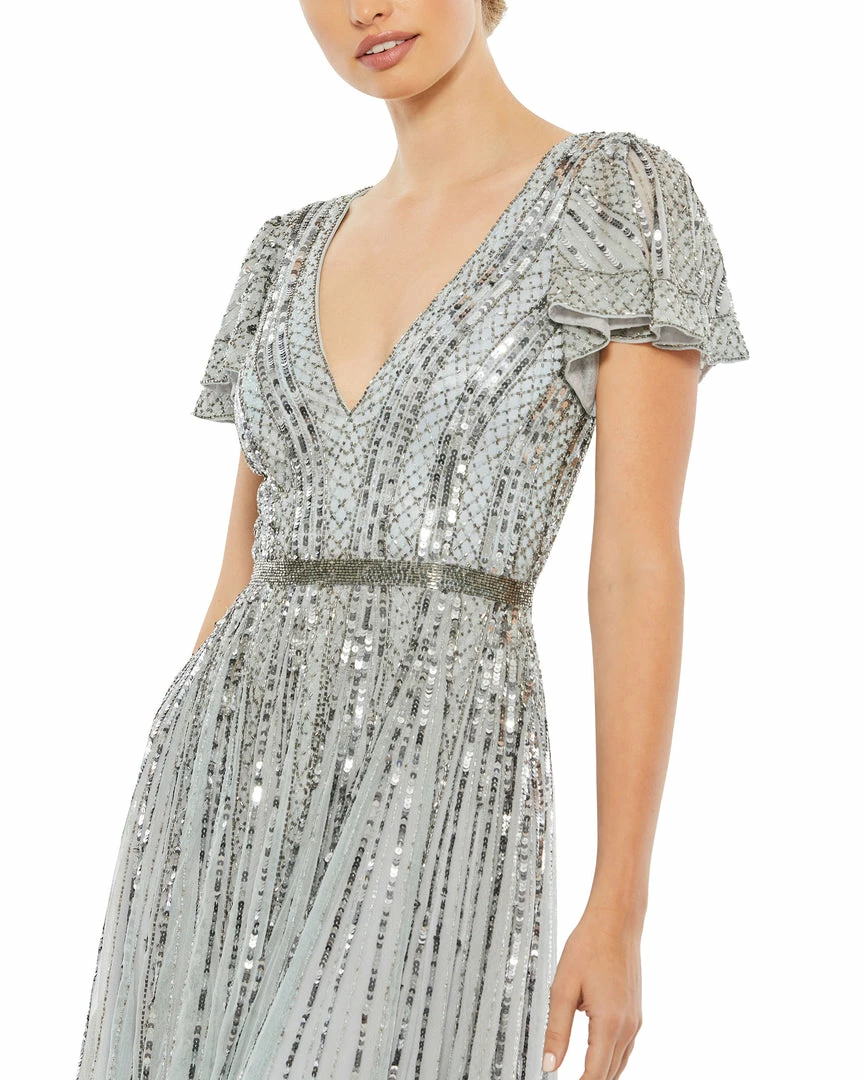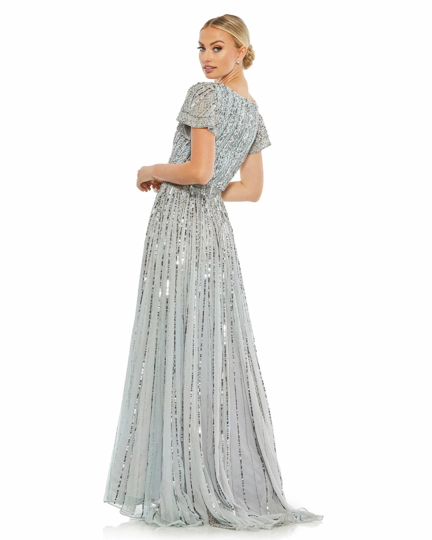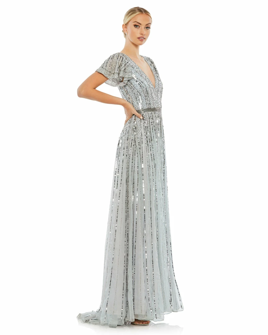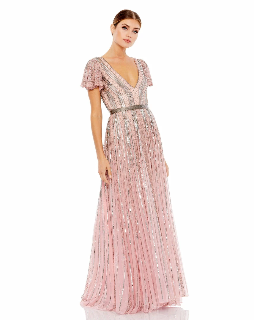 Elegant rose striped sequin gown with gunmetal beading throughout. Finished with bell ruffled sleeves and a hand-beaded belt.