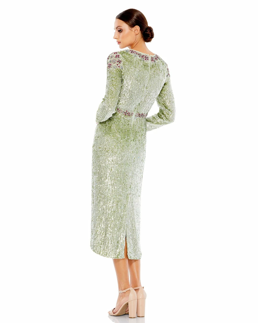 If a diamond necklace is your coveted accessory, then this decadent style is your wish list dress. The sensational dress is cut in a modest midi sheath completely covered in sequins that add texture and shine. Bloom-arranged jewels glitter at the collar, shoulders, and waist in a belt-like accent.