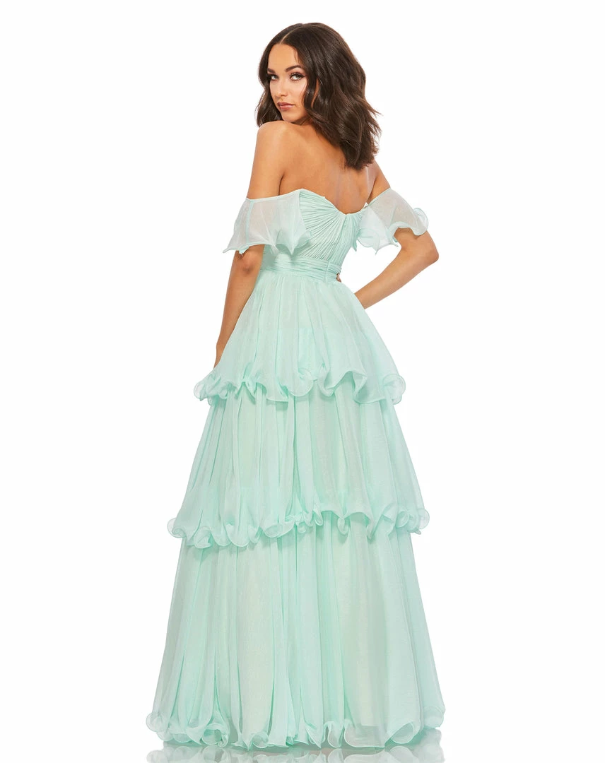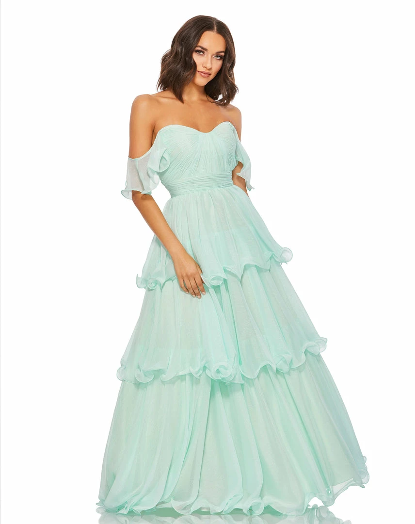 We love how feminine and playful this vintage-vibe dress is. Cut from shimmery chiffon fabric, the flirty gown features a sweetheart neckline, flouncy off-the-shoulder sleeves, a ruched bodice, and a ball gown skirt with ruffled-edge tiers. It’s the perfect balance of structure and fluidity.Â