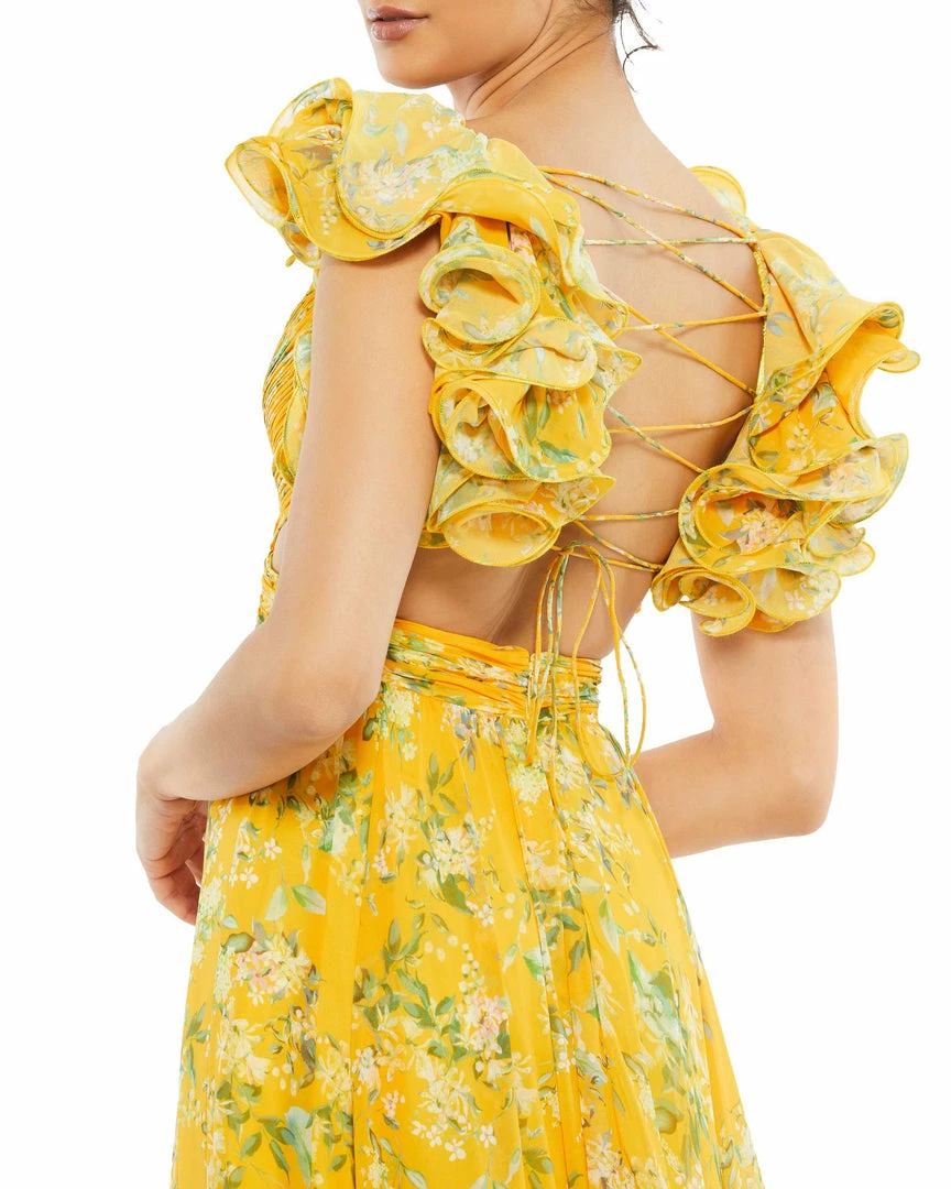 Gorgeous chiffon maxi dress with cut-out sides and back, pleated bodice, and a sexy lace-up open back. Dramatic ruffles accent the shoulders, and a flowy tiered skirt completes the look.